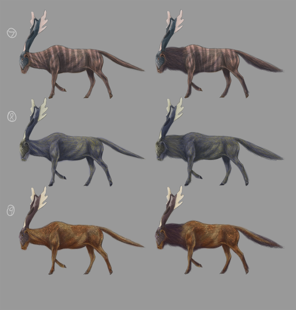 Here are multiple fur texture variations on all the colour schemes from the previous post. I studied the patterns of horses and zebras to come to a conclusion of the 3 main types of pattern that would be appropriate for this creature. They are large spots, stripes and speckled.